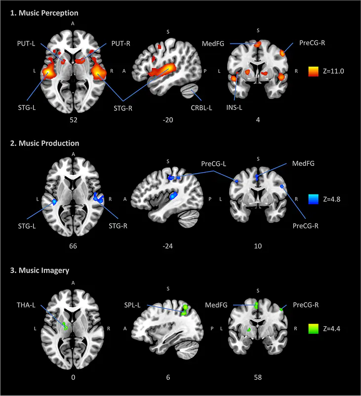 Pando-Naude, Victor, et al. “An ALE Meta-Analytic Review of Top-down and Bottom-up Processing of Music in the Brain.” Nature Scientific Reports, vol. 11, 2021, doi:10.1038/s41598-021-00139-3.